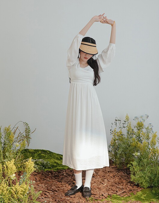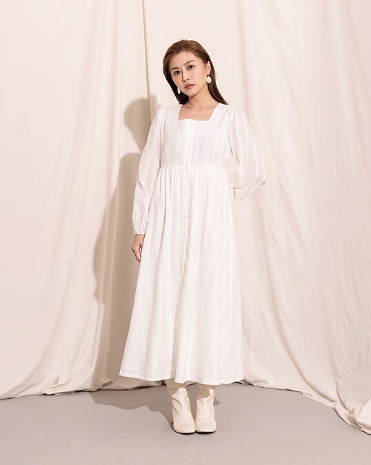▼白色寬鬆洋裝推薦款式4:Meier Q 方領復古收腰洋裝,售價NT$890