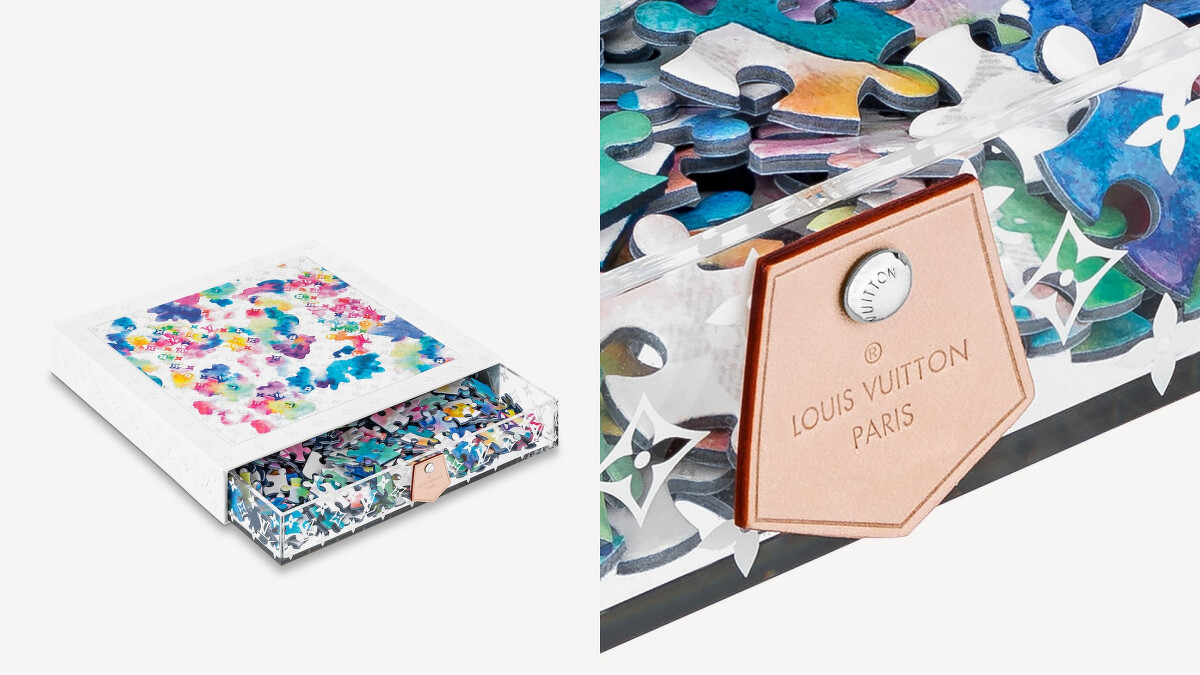 前兩個月,LV 發表的2021夏日膠囊男裝系列,以水彩暈染的手法詮釋夏天活潑的氣氛,而相同的水墨花色,路易威登還推出了拼圖組。從外包裝便可以感受到這一組拼圖與眾不同的奢華感——白色的LV Monogram紙盒印著拼圖的完成圖樣,內部的透明壓克力印著相同的花色並配上皮革貼片作為拉環。