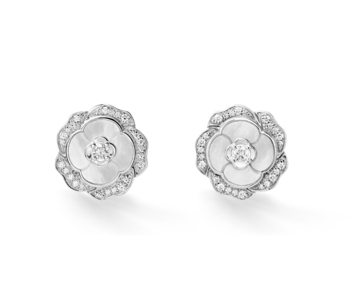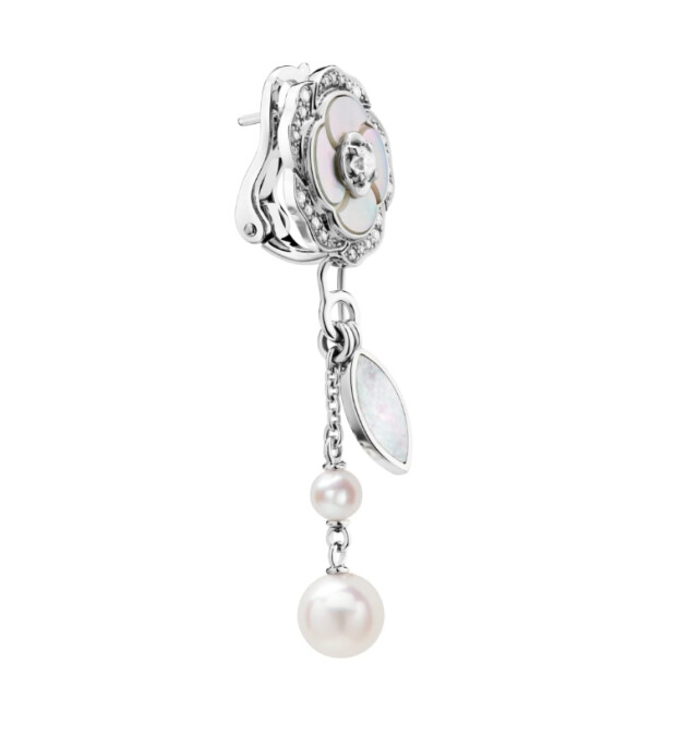Bouton de Camélia 可變換造型耳環18K白金,鑲嵌鑽石、養殖珍珠和白色珍珠母貝,售價NT$444,000