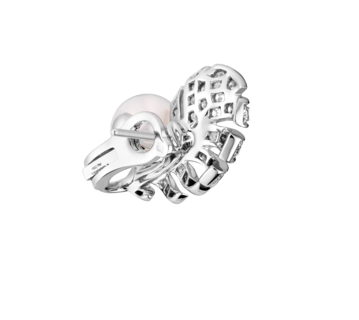 Piaget Rose伯爵玫瑰花自2012年即問世,大致上來說可分出雕塑、鏤空與蕾絲三種工藝形式來呈現玫瑰花造型;這款以貴金屬描繪盛開花形的鑽石耳環,下擺處妝點了能搖曳擺動的珍珠,帶出珍珠的容華與質感。