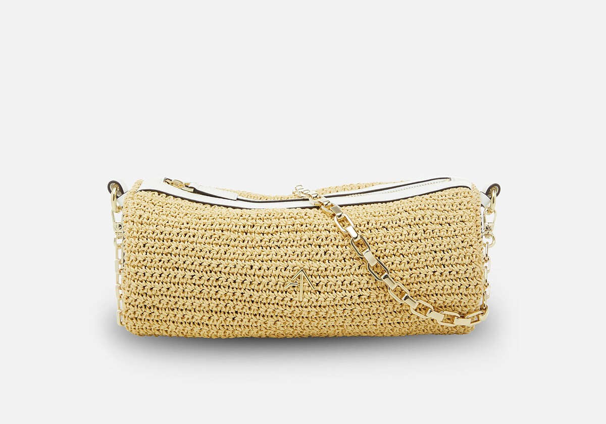 今年Manu Atelier還有推出草編面料的圓筒包,米黃色調的包包,兩側配上白色皮革點綴,與前款不一樣,草編款的金屬鍊條更為細緻,給人比較優雅的氣質。