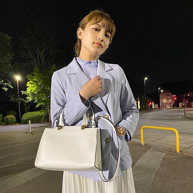 現在想必是人手一件了「西裝外套」,但想搭出與眾不同就難了!比起多數人與褲裝做搭配,不喜歡一樣的真柴,選用純白的百褶裙與淡紫灰的雙排扣西外去組合,展現淡雅氣質,最後再神來一筆用荷葉領內搭做點綴、增加層次感。