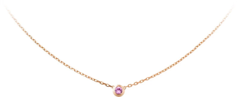 推薦一:Sunlight系列項鏈,18K玫瑰金,鑲飾1顆明亮形切割圓形鑽石(約0.06克拉)和6顆粉紅色藍寶石(約0.48克拉),售價NT$108,000