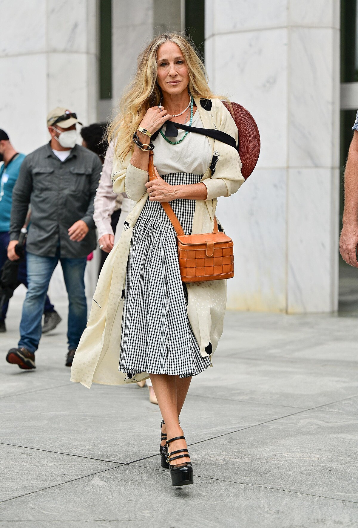 而在首張曝光的劇照中,凱莉身穿高腰的黑白格及膝長裙、白色上衣以及米色長版罩衫,打造出多層次的時髦感;配件方面則是選擇了深棕色的牧羊女草帽和焦糖色的編織小包,整體感覺多了一點俏皮的探險調調。