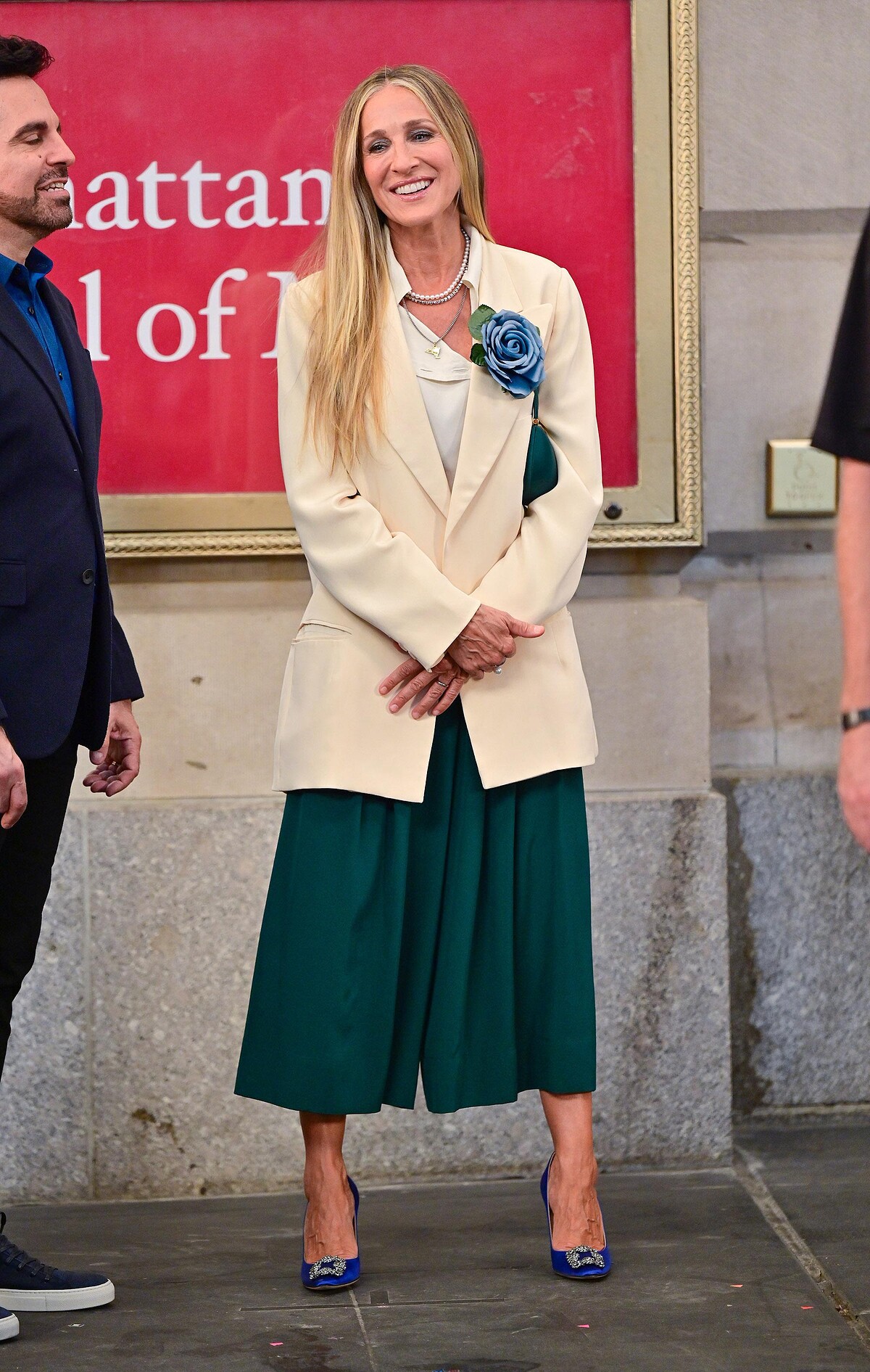 最後一套,則要帶大家來看凱莉的晚宴穿搭,有別於常見的小禮服或是裙裝造型,凱莉本回選擇以俐落的墨綠色七分褲,搭配氣質的奶油白色西裝外套,腳上穿的則是Carrie Bradshaw的愛牌Manolo Blahnik的藍色緞面跟鞋,得體卻又不失個性。