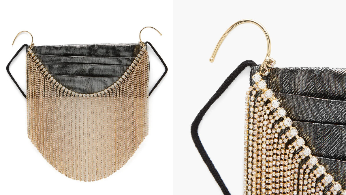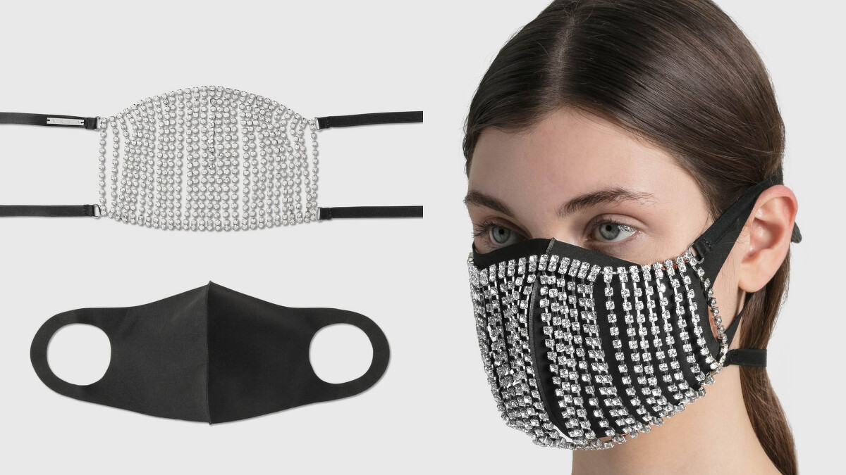 來自Rosantica的水晶口罩,用金色鍊條配上水鑽做出流蘇的設計。品牌附上的黑色口罩為一般的布口罩,可以將金鍊裝飾吊掛在醫療口罩上搭配著使用。