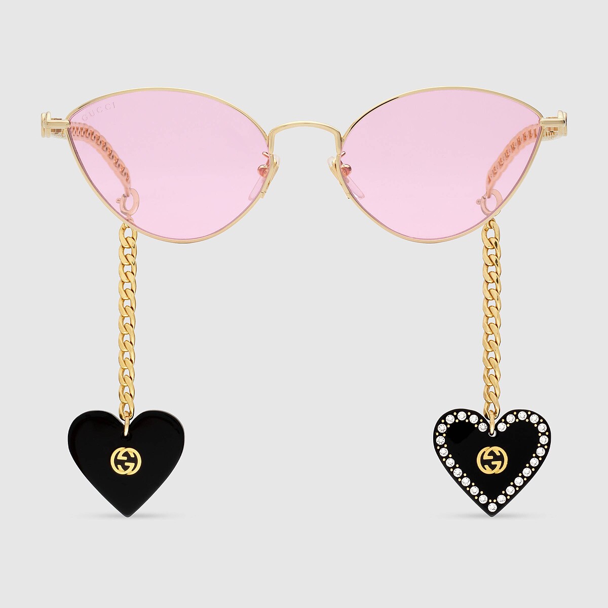 另一款則是將愛心換成吊飾的設計裝飾在太陽眼鏡的鏡架上,以金色鏈條與眼鏡串接在一起,兩邊的愛心設計成不對稱的樣式,一邊以簡約的黑色愛心配上「GG」logo、另一邊則加上水鑽細節。