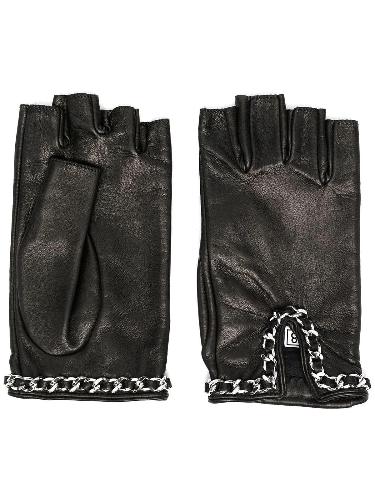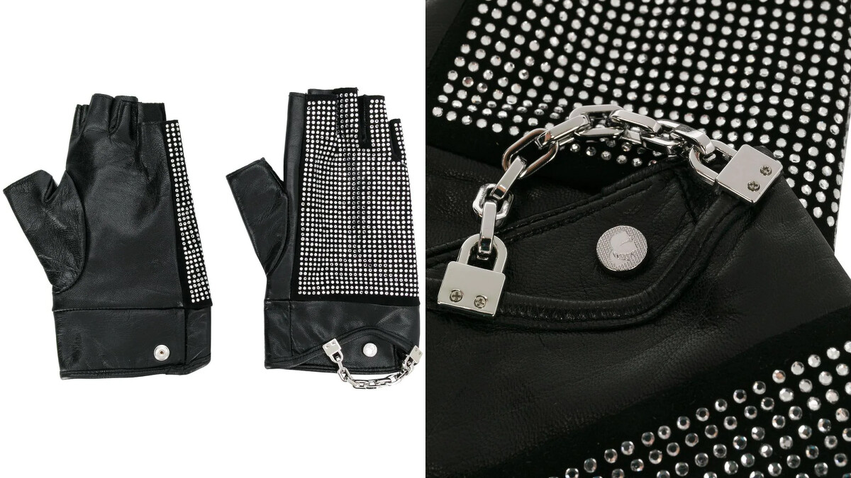 老佛爺Karl Largerfel生前也經常帶著皮革手套出現在各大時裝週與派對,同名品牌推出的露趾手套,手背的部分鋪滿小水鑽,右手另外加上鎖鏈與鎖頭裝飾,帶有十足的個性風格。