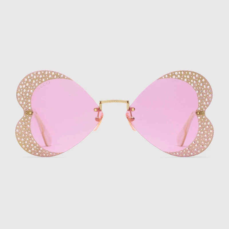 Gucci將愛心向兩側旋轉了90度,像是蝴蝶的翅膀一般,以粉色的鏡片製作,並在愛心的兩側以細緻的水鑽鑲邊。