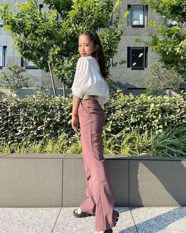 嬌小身材的女孩在穿搭的 key 就是一定要把腰線抓出來,可以看到莉笑子時常都會穿著高腰的褲子配上短襬的上衣,然後繫上各式的皮帶,告訴著大家:我的腰在這!強調腰線之餘,也將女性的柔美曲線展現的一覽無遺。