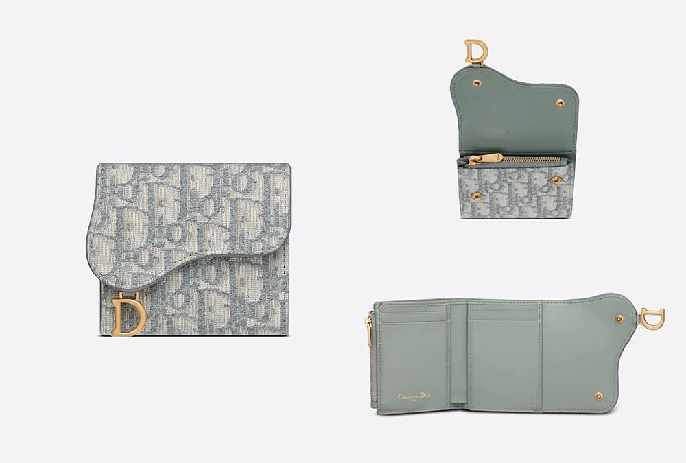 Dior最熱賣的短夾Saddle,秋冬也換成特里亞農灰Oblique緹花面料,搭配復古金色色調金屬「D」形馬蹬,設有可以放置鈔票、卡片及零錢的夾層。