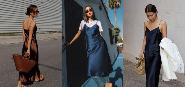 當你覺得單穿一件吊帶款的緞面裙會沒有安全感的話,不妨在裡面內搭一件純色的 T-Shirt ,這個穿搭方法也可以讓對自己身材比較沒自信的搭黨遮住自己較在意的部分,尤其是選擇高腰款的剪裁,可以很好的調整比例,適合推薦給梨形身材的人。(圖片來源:1 2)