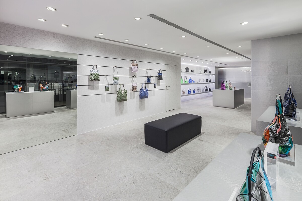這次進駐麗晶精品,為了讓每一款獨特經典包款更為鮮明突出,牆面上使用了日本當地鋁板材質,再透過由職人手工敲打出不規則紋理所保有的手感溫度,讓簡約風格不會過於冷硬,只以冷色調空間強化出飽和色系商品的存在感。