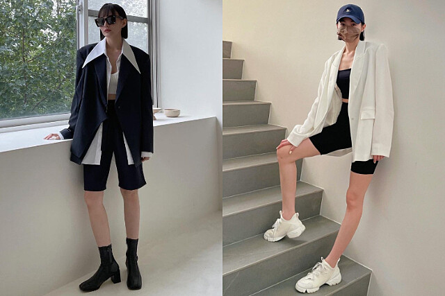 大勢五分褲配上西裝外套一樣百搭!除了挑選相同西裝材質的五分褲,挑選牛仔五分褲、單車褲同樣合適,搭配靴款穿出氣勢,配上球鞋又多了分運動感。有些人可能會怕五分褲會凸顯大腿、臀部,因而不敢輕易嘗試,若擔心穿搭 NG 可以選擇 Oversize 版型的西裝外套,長度剛好遮住屁股,落在大腿一半的地方能夠加以修飾下身,讓你放心大膽地穿上五分褲。