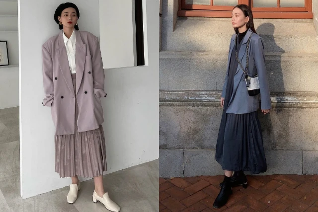 西裝外套搭配裙裝非常適合下班後有約會的搭黨們,既正式又不失休閒氣質。裙裝的部分推薦衣櫃必備款百褶裙和連身洋裝,百褶裙的裙襬設計本身就具有層次感,簡單配上西裝外套就相當有造型感。若擔心穿裙裝會顯臀部,同樣建議挑選寬鬆版型的西裝外套,可以巧妙修飾下半身。