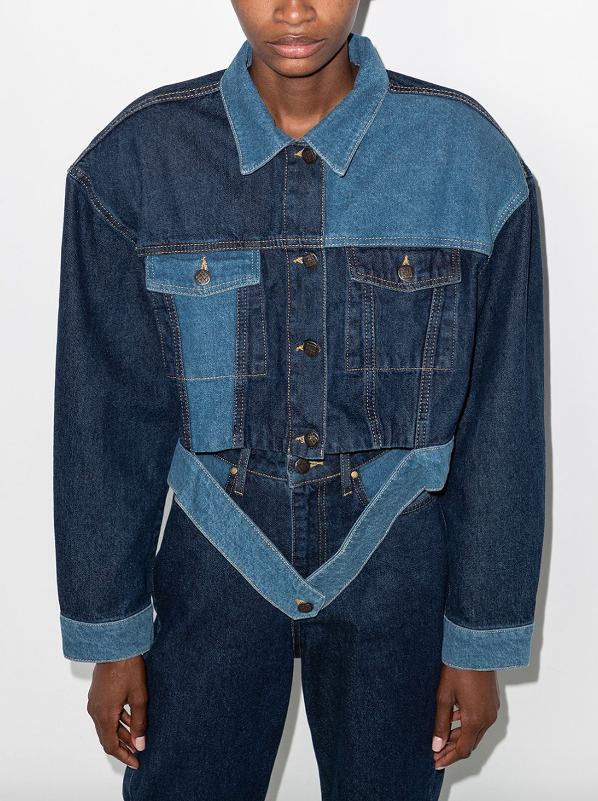牛仔外套是春秋時節最好的百搭單品,這款短版的拼接外套正適合搭配現在熱潮上的高腰牛仔褲,外套下擺的設計讓穿搭更顯獨特,也巧妙修飾了在意的肚子線條,很高明。這裡買