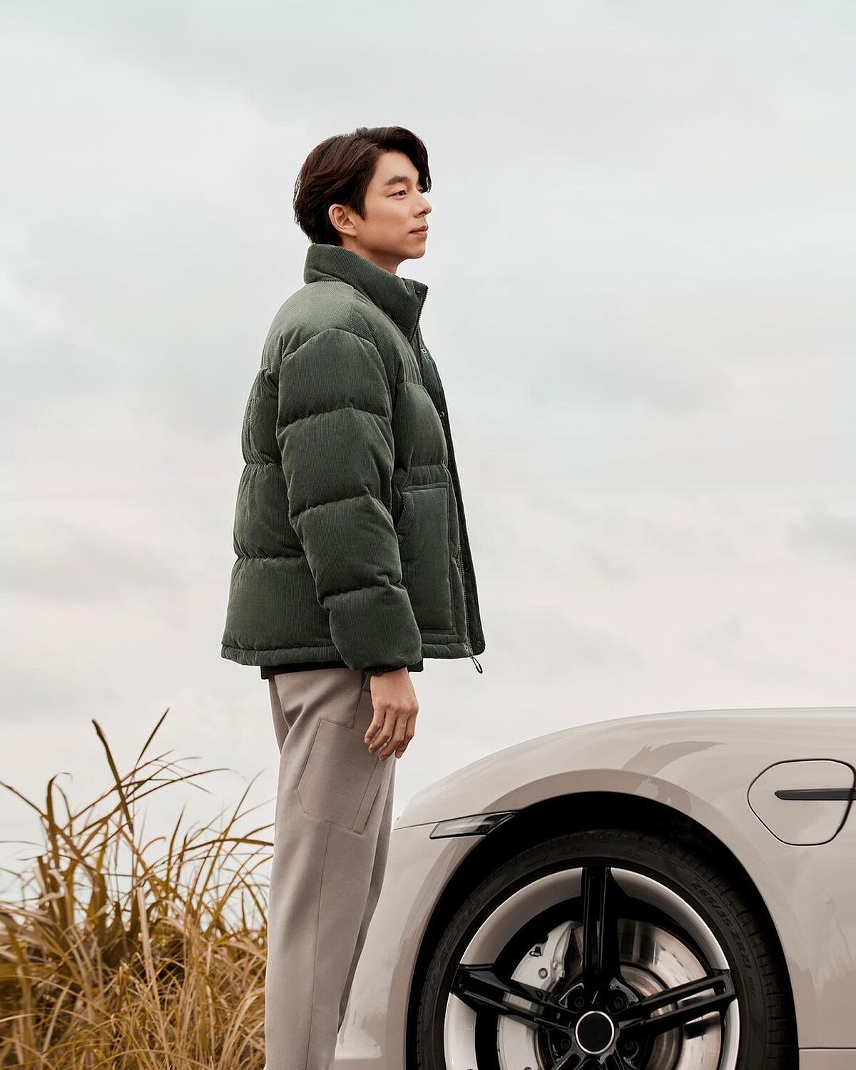 繼羽絨外套、泰迪熊夾克後,今年秋冬可不能錯過燈心絨材質的外套款式,孔劉穿上墨綠色的燈心絨外套,裡頭則是換上大學T搭配束口長褲,營造率性不羈的迷人魅力。