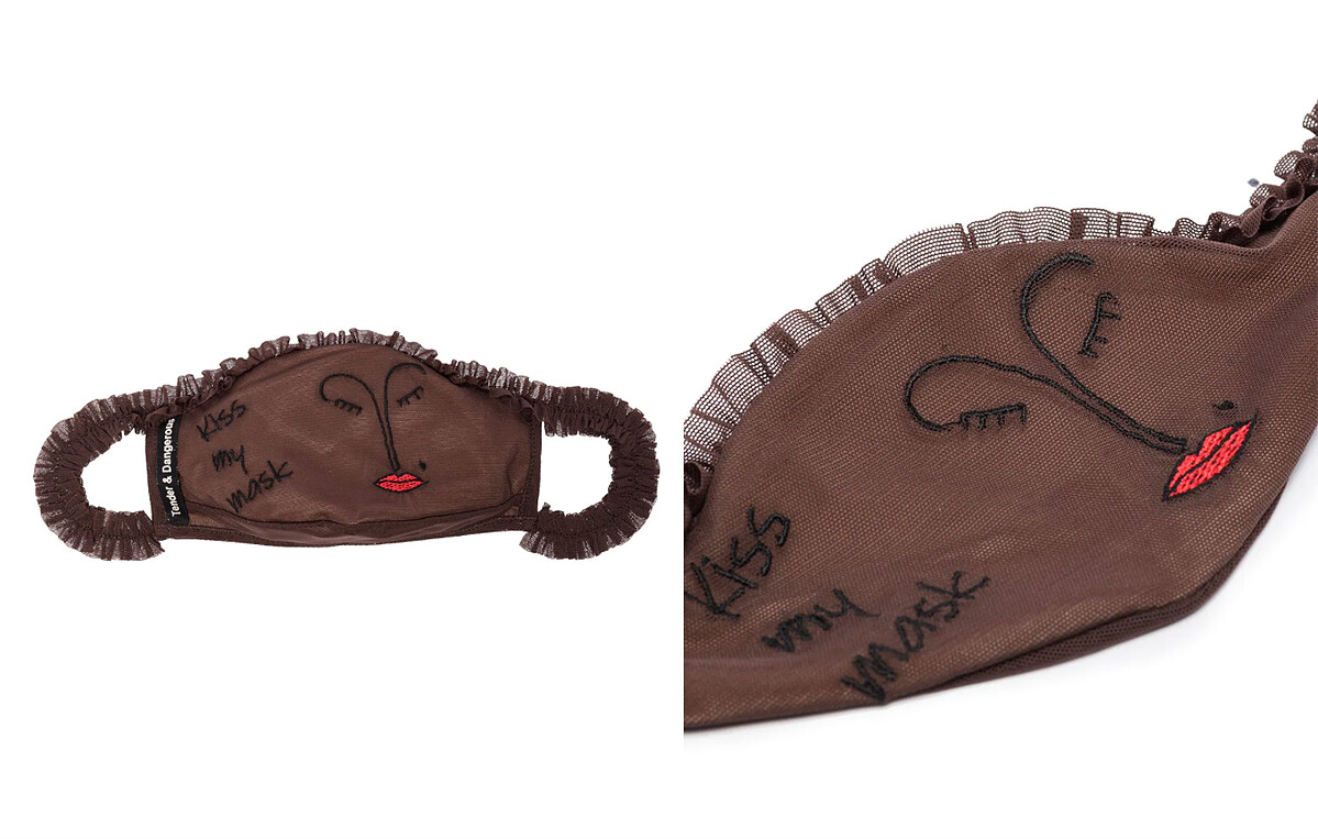 它不只是口罩!設計師將口罩的圖樣延伸至領間,不只照顧了口鼻,脖子及胸口的肌膚也通通涵蓋,讓鼻子以下的造型可以與衣著完美相搭。