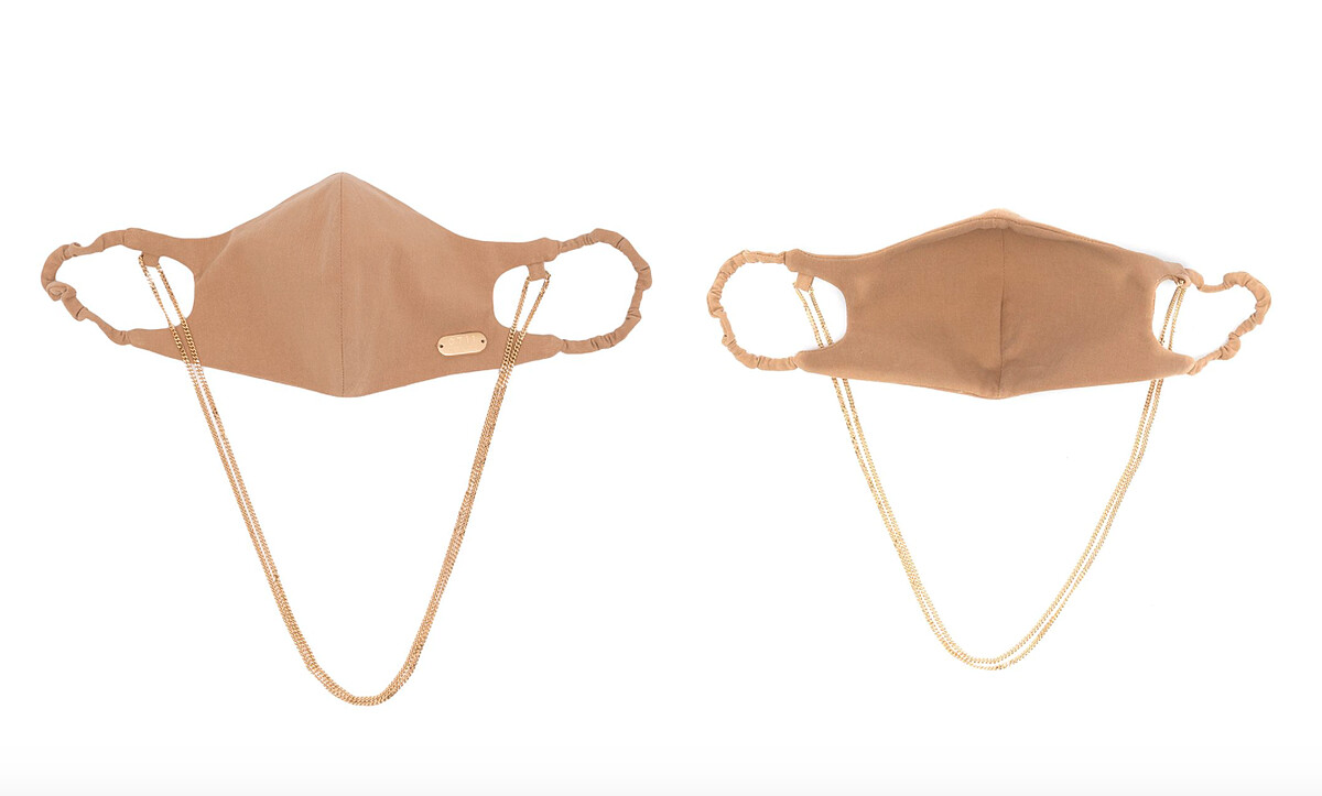 溫潤的米色系正呼應著近幾年服裝色彩的趨勢,金色的口罩鏈不僅增加使用上的便利性,也讓造型多了時尚感。