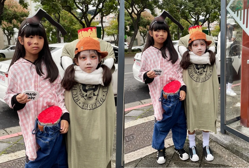 每年都會一起以同個主題為裝扮造型的姐妹花,今年在媽媽的巧手下成了驚嚇指度百分百的斷腳及斷頭造型亮相,走在街上可是相當吸睛。