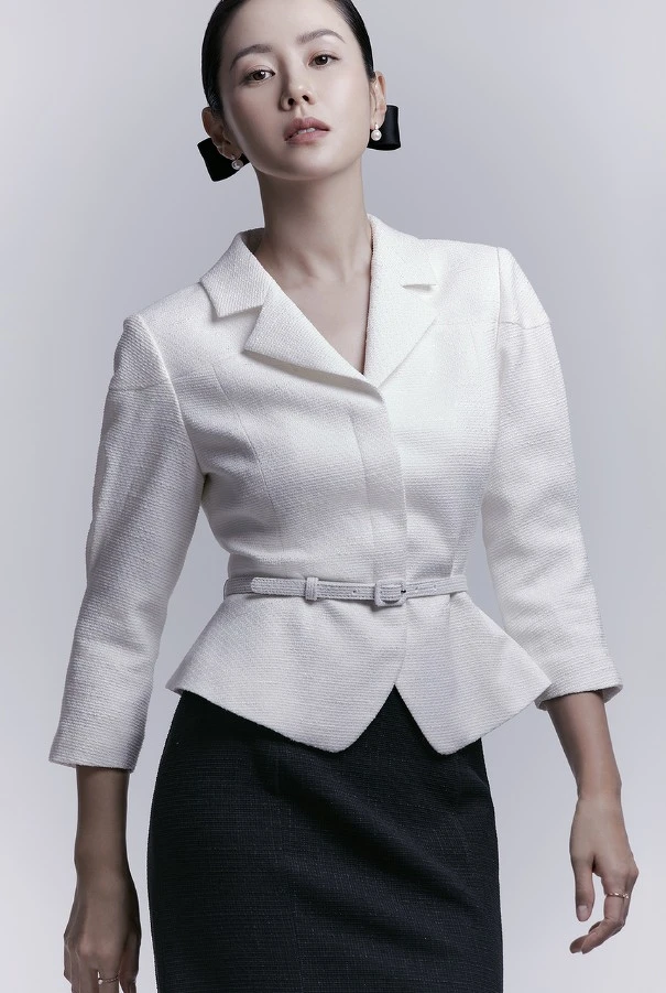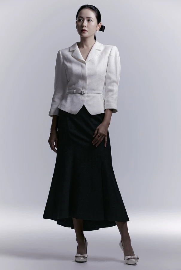 毛呢材質的西裝領外套,孫藝珍選擇仙氣破表的純白色,下身則搭配長度碰到腳踝的黑色細摺長裙,整體看起來既復古又優雅。