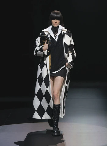 Valentino 在AW21米蘭秀上,以黑白色調為主題結合經典的菱格元素,看似簡單卻相當耐看,以刻意拉長的大衣作為外層,內層搭配短裙或短褲讓層次更明顯。如果妳今年秋冬打算以黑白色作為造型,不妨參考。