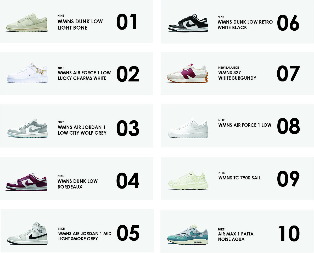 首先看到女性鞋款排行,上榜的依舊以 Nike Dunk 為主要鞋款,這鞋款已從上半年就深受女性歡迎,全世界的 Kol 或時髦人士的街頭搭配率都相當高,甚至妳在信義區晃一圈就可以看到同類鞋款。