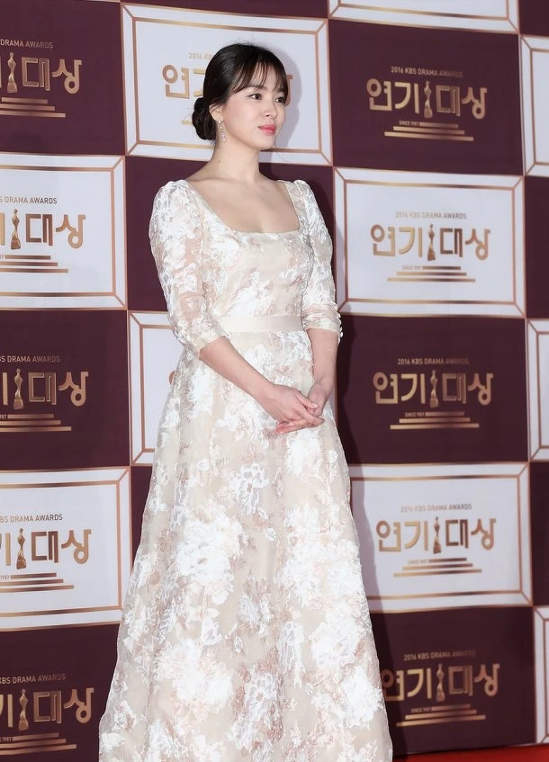 以韓劇《太陽的後裔》出席KBS演技大賞的宋慧喬,換上氣質米白色方領刺繡長禮服登上紅毯,擁有白皙肌膚的喬妹,此套禮服稍顯貴氣。