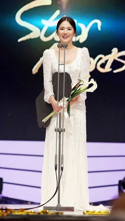 在韓劇《那年冬天風在吹》飾演女主角的宋慧喬,受邀出席第2屆APAN Star Awards大賞,喬妹換上白色蕾絲刺繡長禮服,以微露鎖骨的小性感,成為全場目光的焦點。