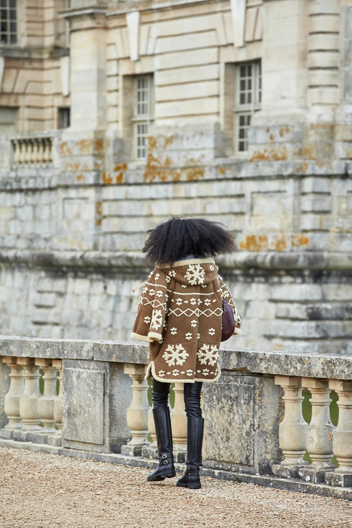 CELINE 在 2021 秋冬系列也有北歐圖騰的披肩式大衣,可以運用上寬下窄的搭配方式呈現。
