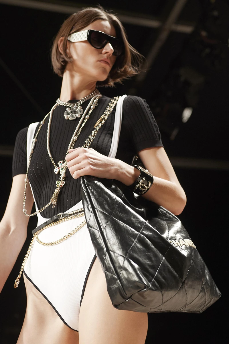 Chanel 2022 春夏系列,經典菱格紋配上大包設計,將摩登旅行感結合當代女性,彰顯時髦率性的中性特質。