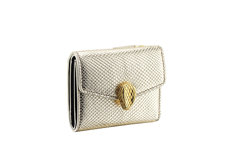 出自Serpenti Forever系列的淡金色金屬水蛇皮零錢包,閃耀著金屬光芒,搭配黑色小牛皮內襯,並以紅色琺瑯作為蛇眼鑲飾,皮夾分成兩個部分,一邊為4格卡片夾層和鈔票夾層,另一邊則是放至零錢的暗釦袋,錢包十分小巧, 推薦給愛背小包的你。