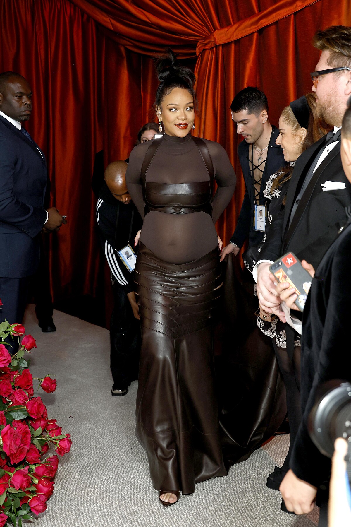 若要討論孕婦穿搭,還有誰能超越蕾哈娜?以表演嘉賓之姿亮相第95屆奧斯卡,先以第一套透膚緊身衣拼接皮革面料的禮服登場,性感之中帶有女王風範,無需過多的珠寶妝點也能有非凡的氣勢。