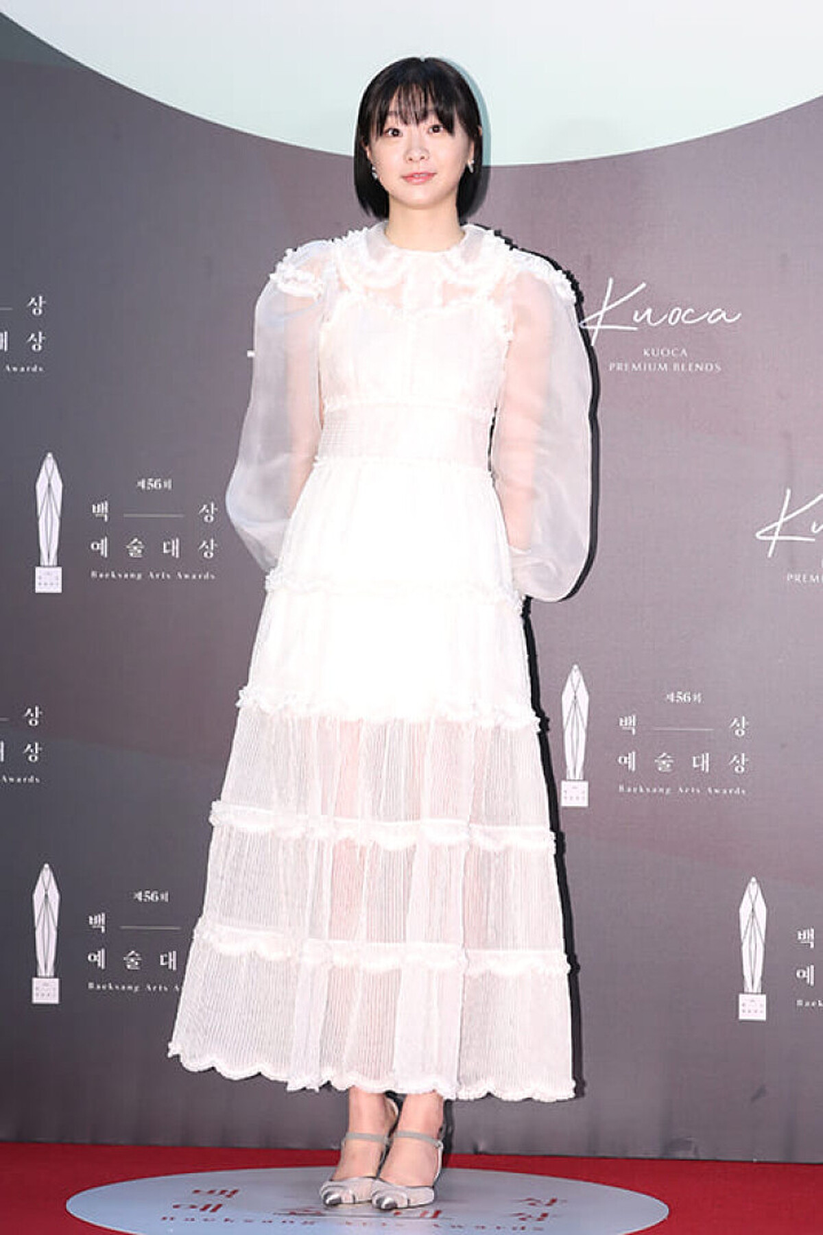 隔年以韓劇《梨泰院Class》再度受邀出席百想藝術大獎,也獲得電視部門最佳女新人獎的榮耀,金多美此次紅毯換上白色薄紗荷葉禮服,浮誇的蓬袖設計增添俏皮感,微透視的荷葉裙讓金多美的腿部曲線若隱若現,讓人印象深刻。