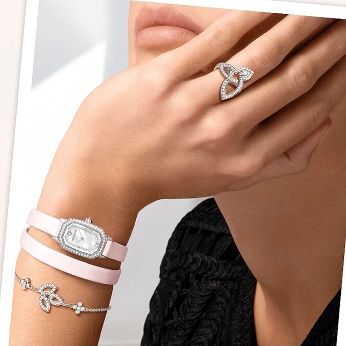 17x24毫米18K玫瑰金錶殼,石英機芯,白色珍珠母貝錶盤,鑲嵌鑽石與海水藍寶石,淺藍色雙圈緞面錶帶,防水深度約30米,售價店洽