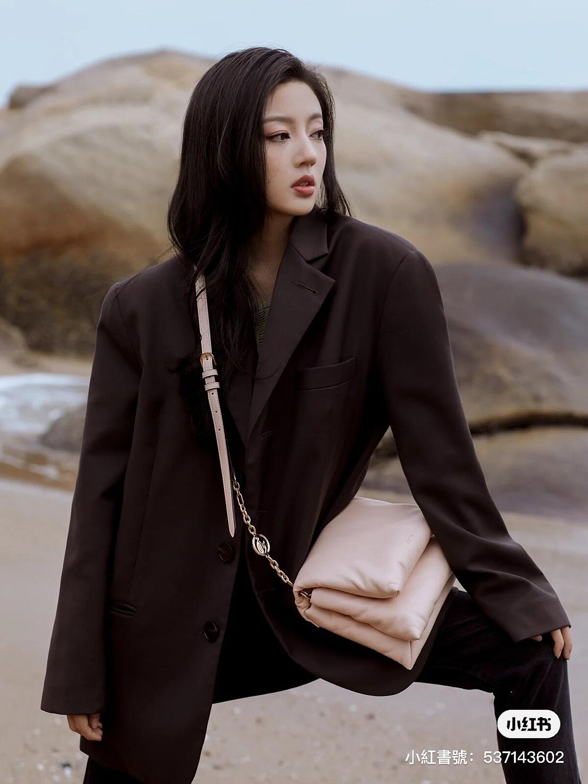 深褐色西裝外套搭配長褲,何瑞賢選擇Lanvin裸膚色枕頭包作為搭配,為幹練穿搭注入一絲活力,整個人看起來不會過於沉悶,外觀柔軟、蓬鬆的枕頭包,也成功讓何瑞賢成為眾人目光的焦點。