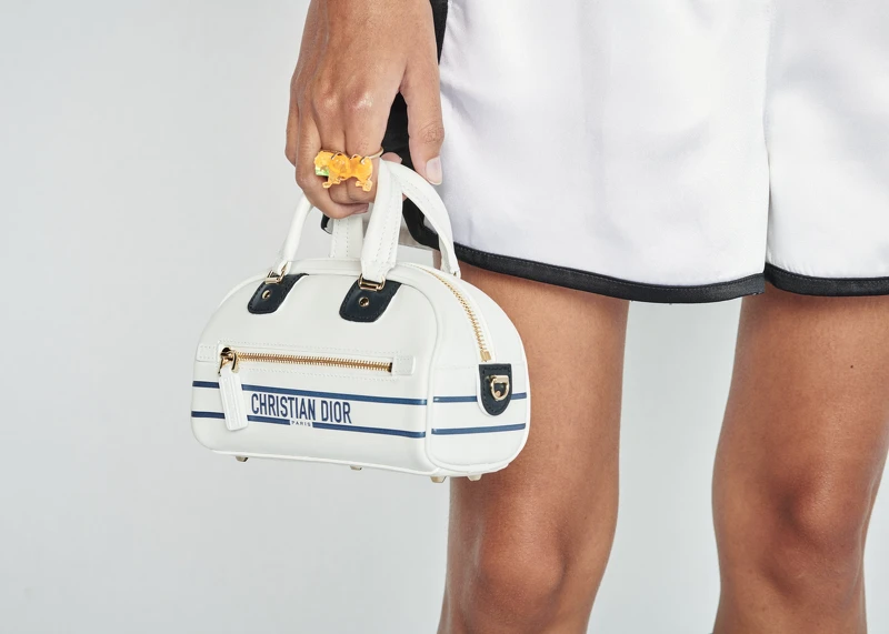 以小牛皮打造的保齡球手提包,本季多了迷你尺寸,包身保留標誌性的Christian Dior書腰式設計,推出亮橘色、海礁藍、經典黑、白等色選。
