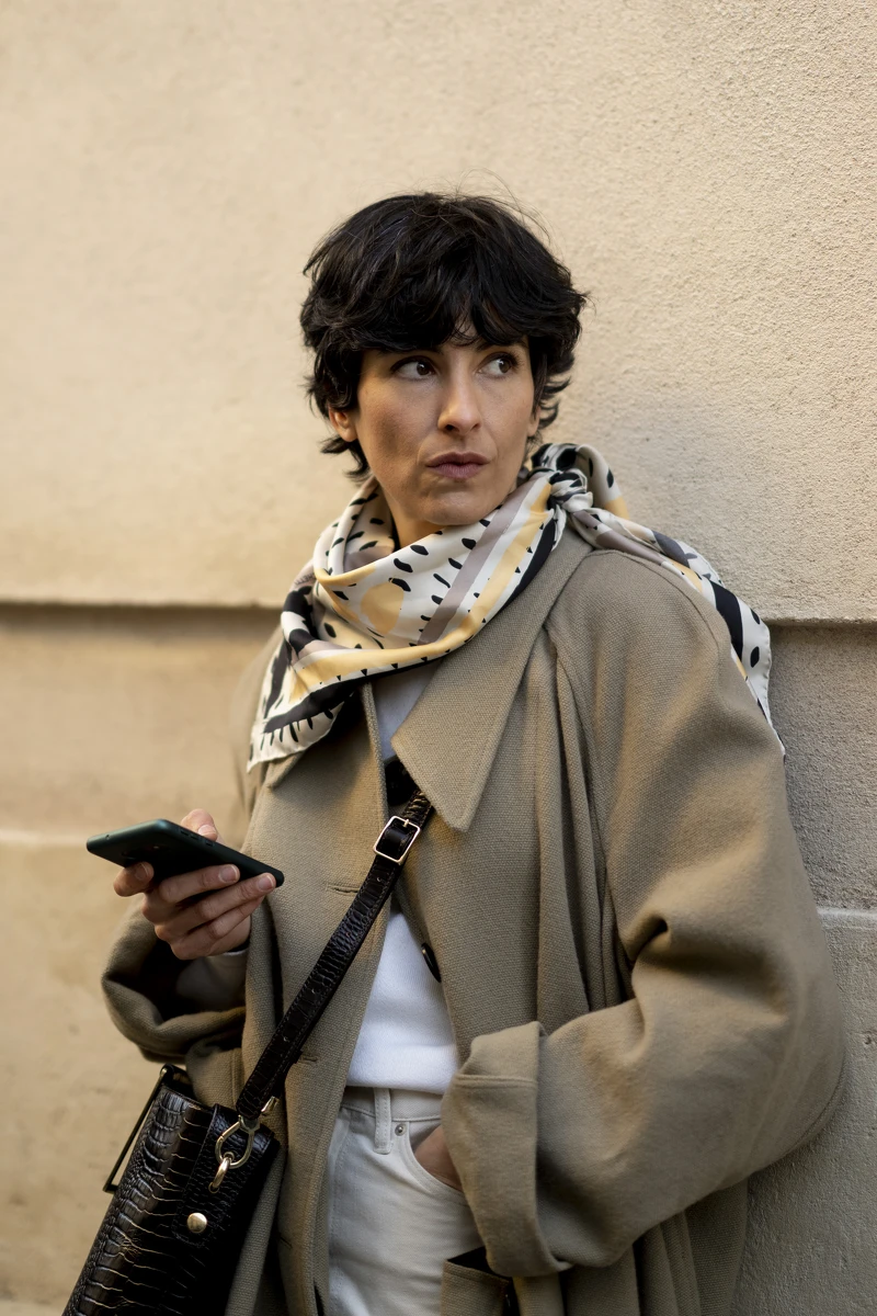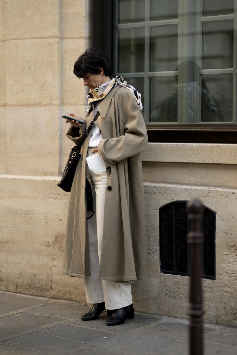 風衣的穿搭運用是不少人在大地色風格會想到的重點單品,需留意造型的比例配置,建議選擇長度過膝蓋的風衣,並搭配領巾達到畫龍點睛的效果。