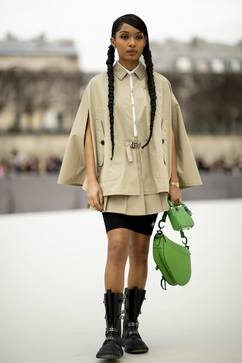 Dior 在 2022 春夏系列推出不少以大地色系作為主色的秀上造型,下半身消失的穿搭技巧讓女人多了個性與率性,橘色切爾西短靴與小包的點綴讓造型增加更多的層次。