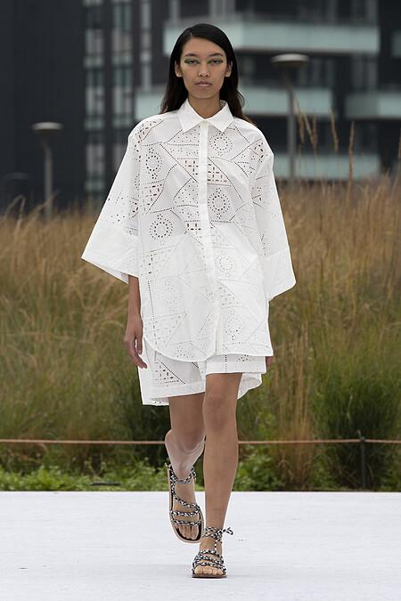 MSGM 2022 春夏系列以寬鬆的白色刺繡襯衫作為造型重點,搭配繫帶涼鞋展現輕盈自在的夏日氛圍。