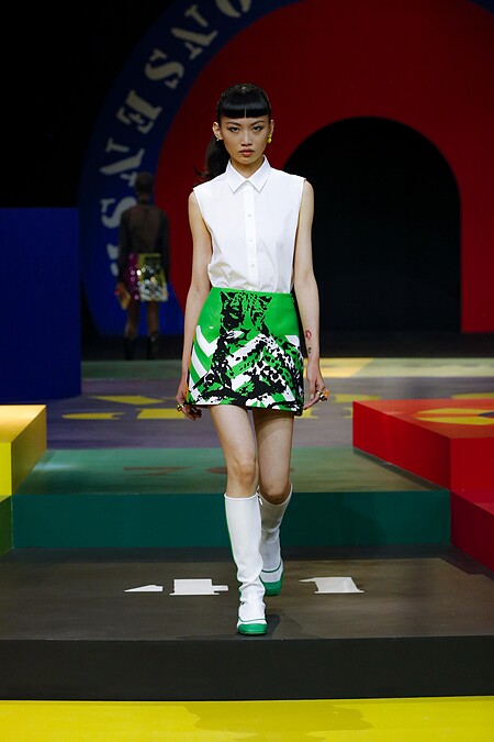 Dior 2022 春夏系列中,無袖的有領白襯衫搭配印花迷你裙,展現時髦俐落的女人特質。