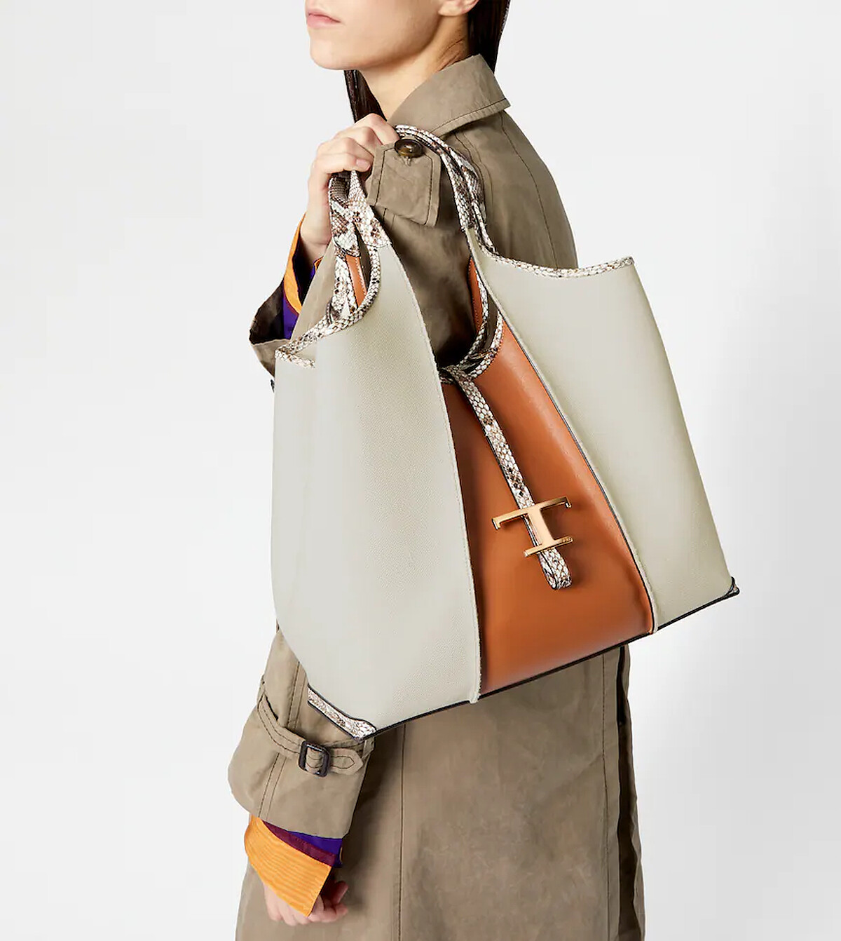 Tod’s Timeless系列旨在打造耐看、實搭的經典設計,自推出以來已囊括了各種不一樣的包型款式。2022春夏以拼接設計重新詮釋托特包,特別之處在於包包邊緣鑲上一圈蛇紋皮革,低調卻極具吸睛效果。