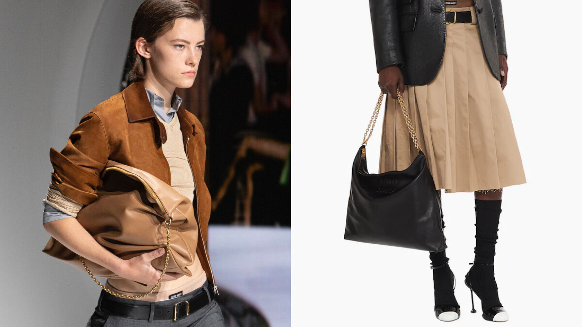 Miu Miu在2022春夏秀上首次露出的皮革肩背包,直直落落的輪廓線條,以壓印的方式落上品牌logo,並附上一條金色鏈背帶,柔軟的皮質不論是肩背,或是手拿都能呈現出不一樣的時髦個性。