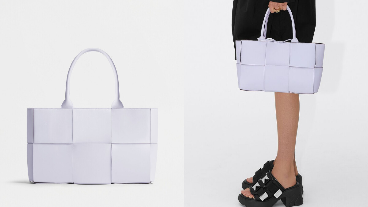 從Arco托特包延伸出來的購物包,沿用原本的粗皮革編織紋路,外型改為更俐落、簡潔的樣式。2022春夏推出多款新色,編輯首推套了仙氣濾鏡的薰衣草紫色,調和大量白色的淡紫色,不像白色那般容易撞款、卻也可以輕易與其他顏色搭配,適合作為春夏穿搭亮點。