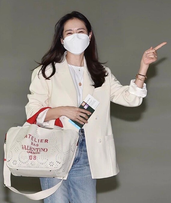走在歐巴後面通關的孫藝珍歐膩,如果你去過仁川機場,應該對於機場的採光有概念,仁川機場是採透明式設計,因此白天的機場相當明亮,沒想到歐膩一現身,整個機場不能只用明亮來形容而是發亮,因為孫藝珍就像自帶超高瓦數的燈泡,照亮機場的每一個角落。與老公玄彬穿上同樣白色T-shirt,下身則搭配割破丹寧直筒褲,並踩著Rachel Cox高跟涼鞋,或許是擔心飛機上太冷,歐膩特別搭配一件氣質滿分的米白色西裝外套,不過說到最吸引大家關注的,無非是孫藝珍手上的Valentino托特袋,為2021早春系列的包款,最早曾在2020秋冬時裝秀上曝光。