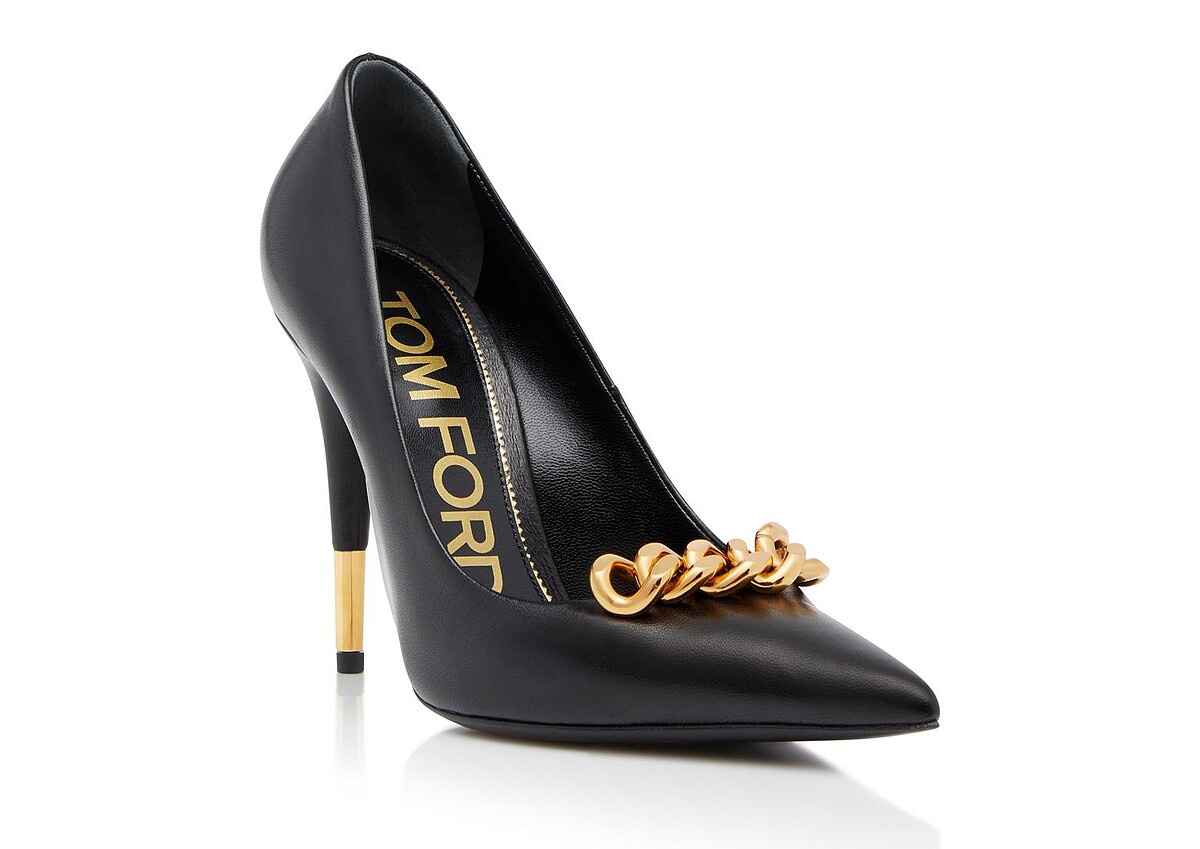 同為黑色尖頭跟鞋,劍持麗子還收藏了一雙Tom Ford Chain系列高跟鞋,除了鞋頭處顯而易簡的鏈條裝飾,鞋跟之處也有彩蛋!末端之處拼接了一段金色鞋跟,暗喻著女主角對於打點細節、收集線索的精明性格。