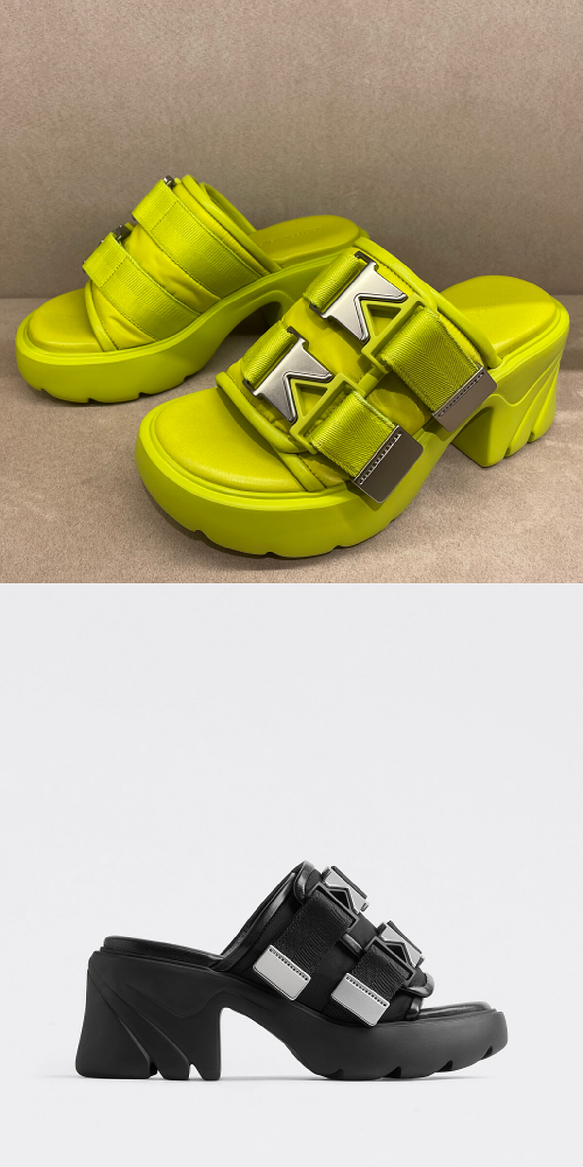 由科技棉與羊皮所拼接而成的Flash高跟拖鞋,鞋面上兩條粗扣帶搭配銀色扣飾,展現出十足的個性;雖有8公分的厚底,在富彈性的橡膠厚底以及和緩的跟鞋坡度組合下,具一定的舒適度。