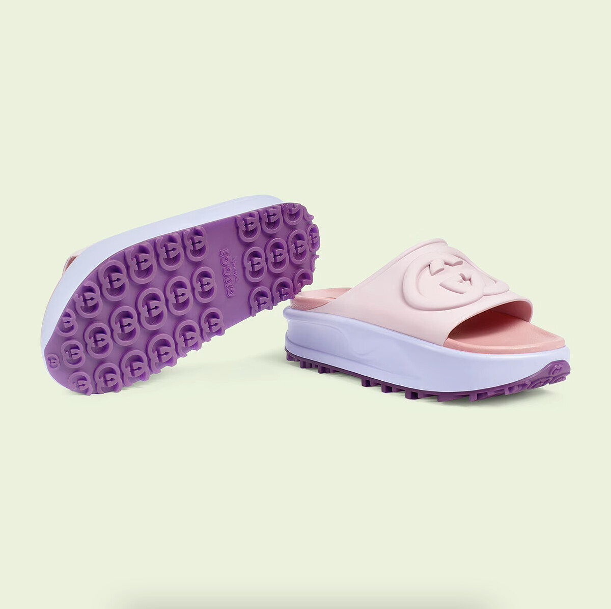 取經90年代時期的運動拖鞋設計,Gucci採用全橡膠的材質製作,除了鞋面上的雙G鎖鏈logo,鞋底之處也有小亮點——滿版的小GG圖樣行行排列,下雨天穿著它出去,走過的地方,宛如蓋印章一般,留下可愛的印記。
