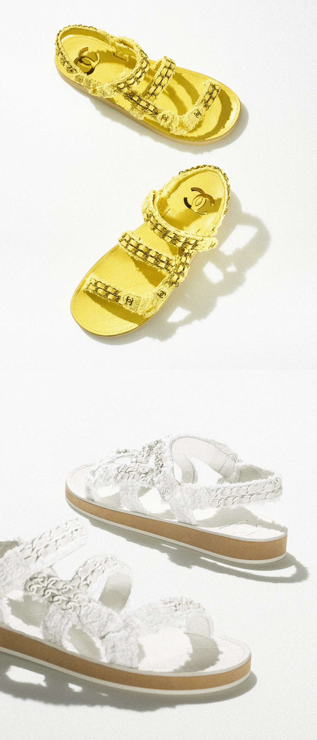 繼先前的菱格紋老爹涼鞋,Chanel 2022春夏再將品牌兩大經典元素——斜紋軟呢與皮穿鏈結合推出新設計。簡練的織帶交織出涼鞋輪廓,有氣質白與檸檬黃兩色:氣質白綴以同色的小雙C logo,檸檬黃則是以金色樣式為點綴,前者較為低調、後者較顯夏日活潑氣息。