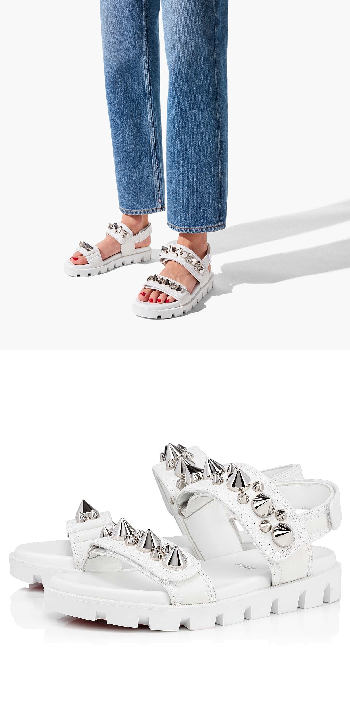 在簡約的白色涼鞋表面添上大小不一的鉚釘裝飾,如冰晶般的銀色鉚釘略帶消暑的視覺效果,小羊皮材質相當親膚、好走。